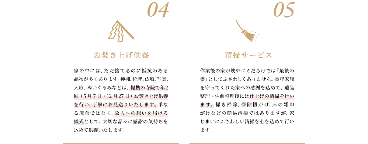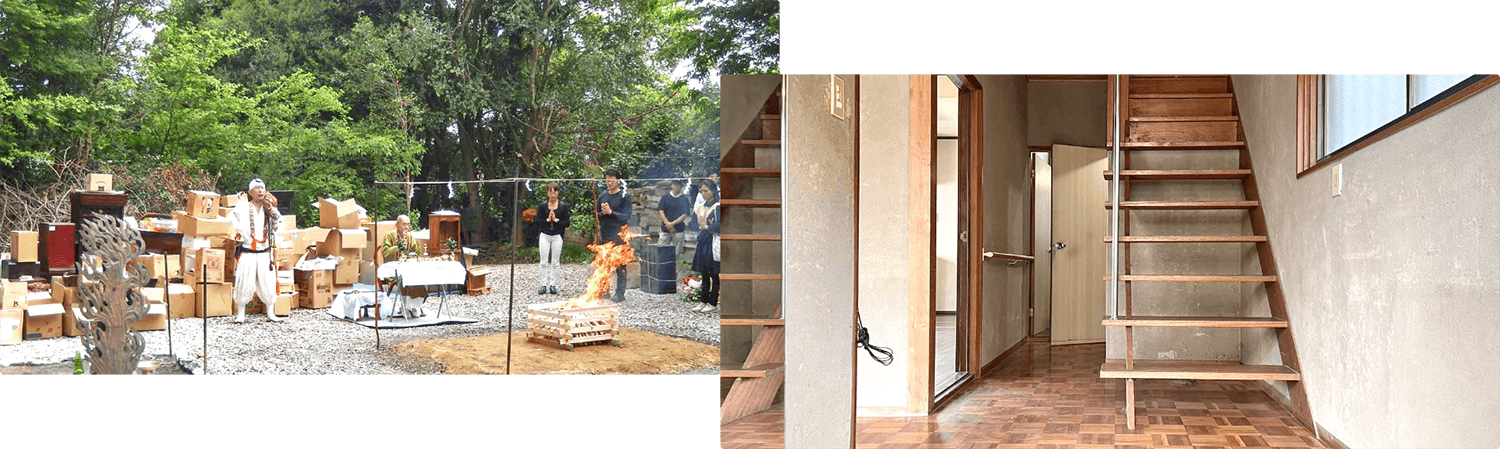 家の中には、ただ捨てるのに抵抗のある品物が多くあります。神棚、位牌、仏壇、写真、人形、ぬいぐるみなどは、提携の寺院で年2回(5月7日・12月27日)お焚き上げ供養を行い、丁寧にお見送りいたします。単なる廃棄ではなく、故人への想いを届ける儀式として、大切な品々に感謝の気持ちを込めて供養いたします。